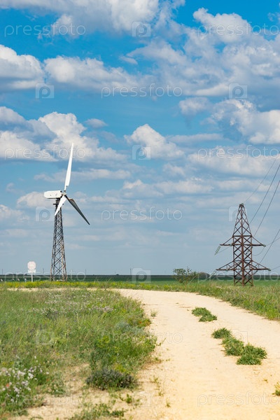Природный ландшафт с высоковольтной башней и ветряной электростанцией