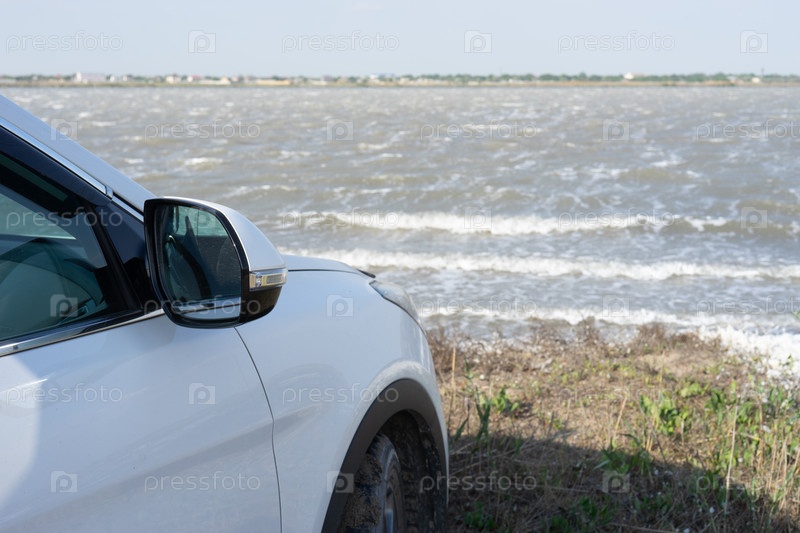 Природный ландшафт с белой машиной на берегу грязевого озера