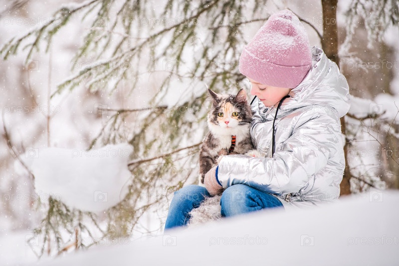 Маленькая девочка сидит с кошкой в объятиях на снегу в зимнем лесу