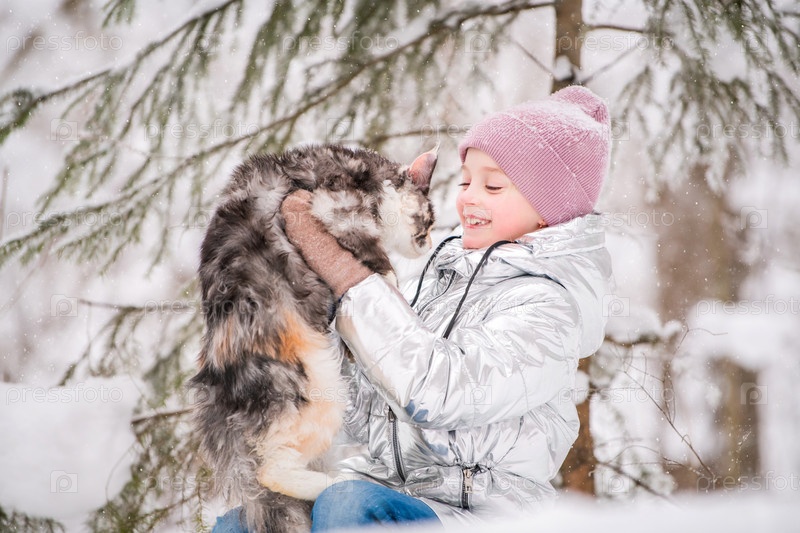 Маленькая девочка сидит с кошкой в объятиях на снегу в зимнем лесу
