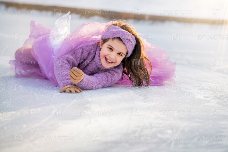 Маленькая девочка в розовом свитере и пушистой юбке в солнечный зимний день катается на открытом катке в парке, падает и смеется