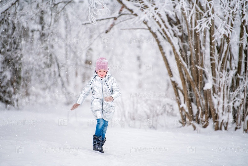 Маленькая девочка бегает зимой в заснеженном парке