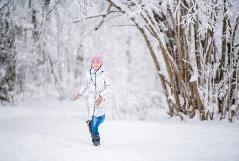 Маленькая девочка бегает зимой в снежном парке