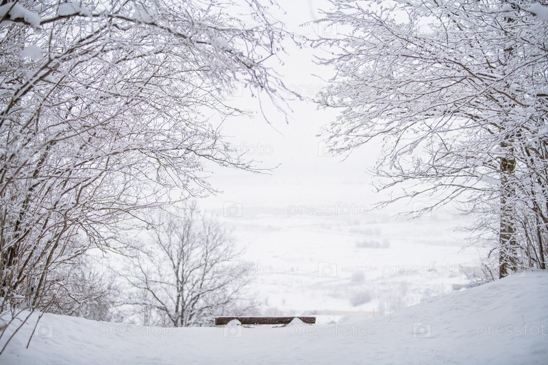 Скамейка на холме с видом на туманный заснеженный пейзаж северного парка