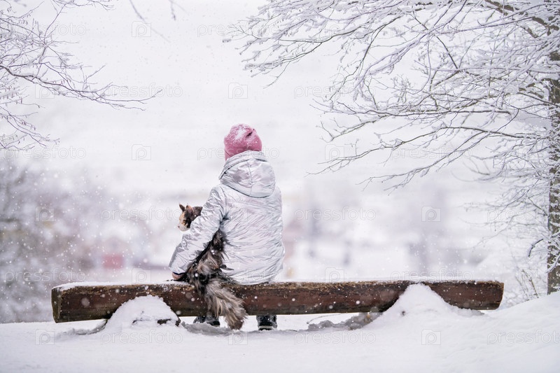 Маленькая девочка в обнимку с большой кошкой сидит спиной на скамейке и смотрит на заснеженный пейзаж, открывающийся с холма