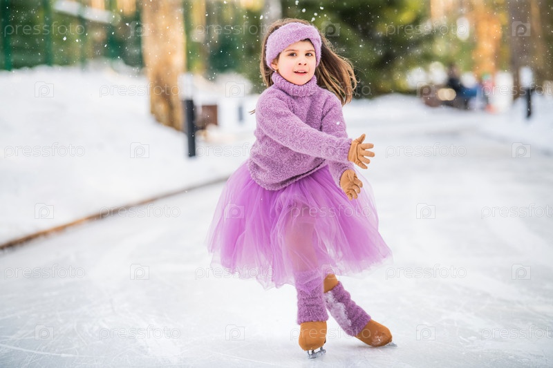 Маленькая девочка в розовом свитере и пышной юбке катается солнечным зимним днем на открытом катке в парке