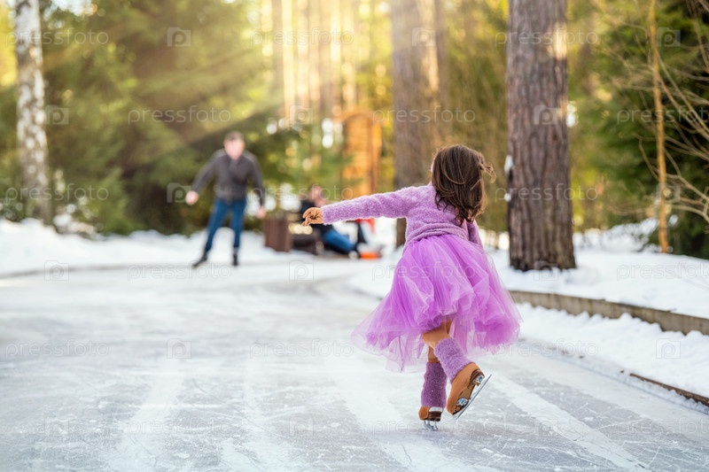 Маленькая девочка в розовом свитере и пышной юбке катается солнечным зимним днем на открытом катке в парке, вид сзади