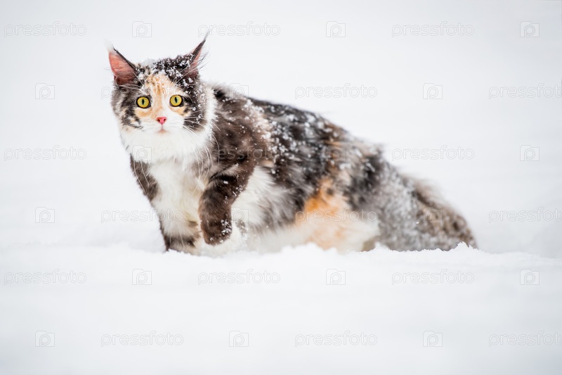 Полихромный кот мейн-кун сидит зимой на снегу в лесу