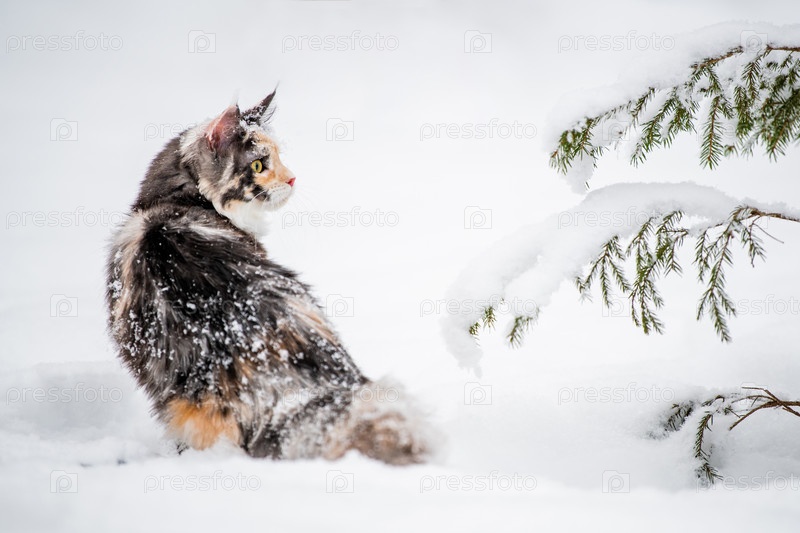Полихромный кот мейн-кун сидит на снегу на улице зимой на белом снегу