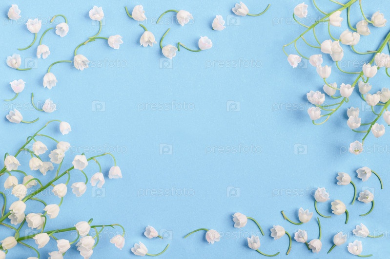 Белые цветы ландышей на синем фоне. Праздничная открытка. Поздравление. Копировать пространство