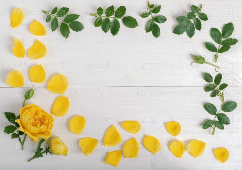Композиция из желтой розы, лепестков и листьев
