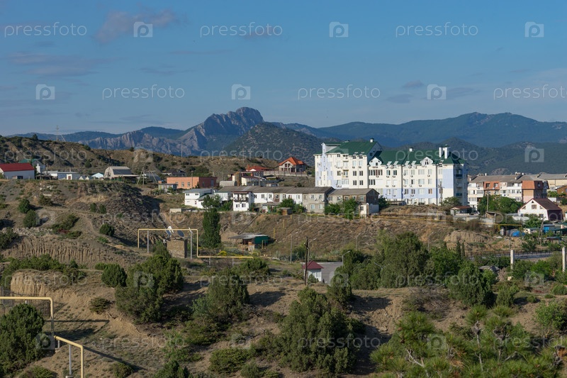 Пейзаж с видом на горы и дома в Судаке, Крым