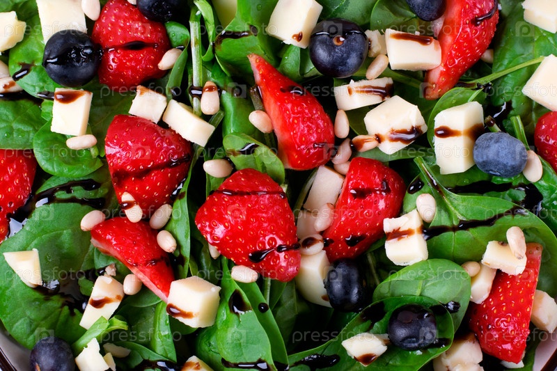 Салат с клубникой, шпинатом, черникой, сыром качотта и кедровыми орешками, заправленный бальзамической глазурью. Здоровая еда. Вид сверху. Полный кадр