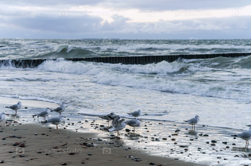 Чайки на берегу моря. Погода на морском курорте ненастная. Осенний морской пейзаж
