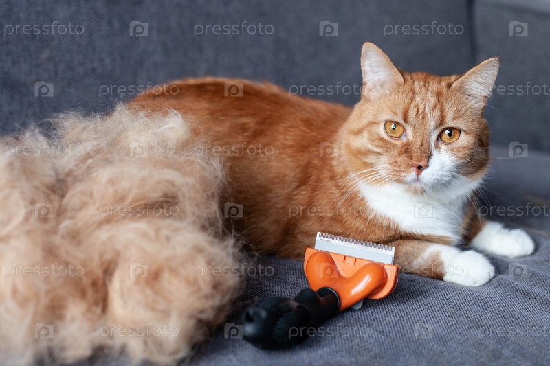 Рыжий кот на сером диване рядом с кучей своей шерсти после расчесывания фурминатором. Сезонная линька