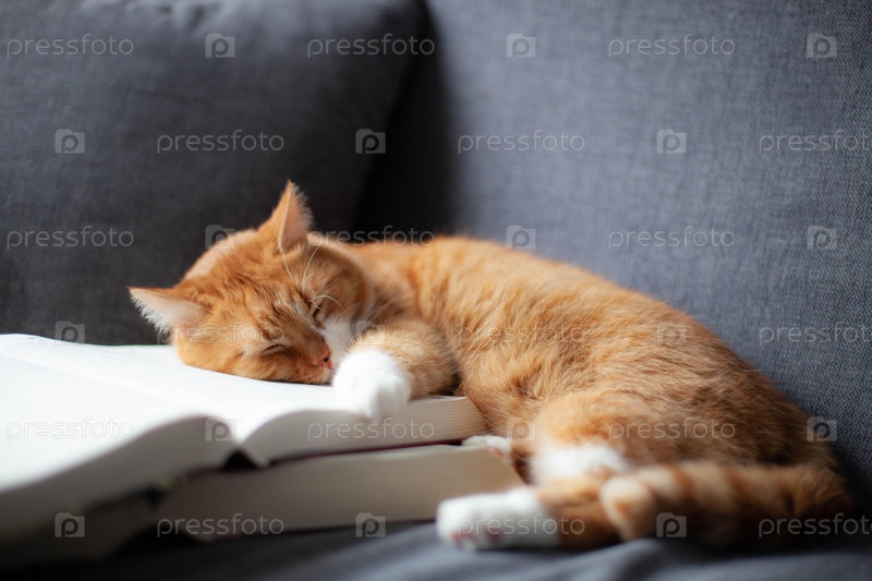 Рыжий кот свернулся клубочком и спит на двух больших толстых книгах. Концепция образования и трудности в обучении