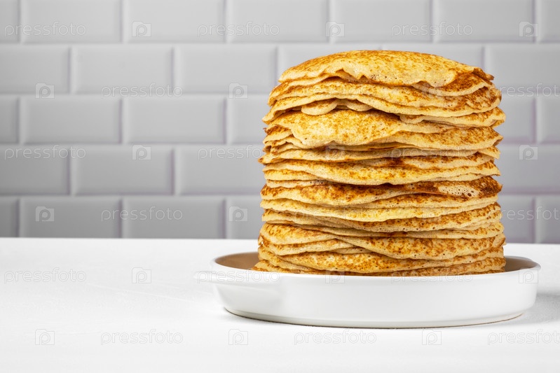 Стопка свежеиспеченных блинчиков лежит в белой керамической форме
