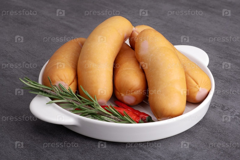 Несколько сосисок лежат в белой керамической посуде для приготовления пищи