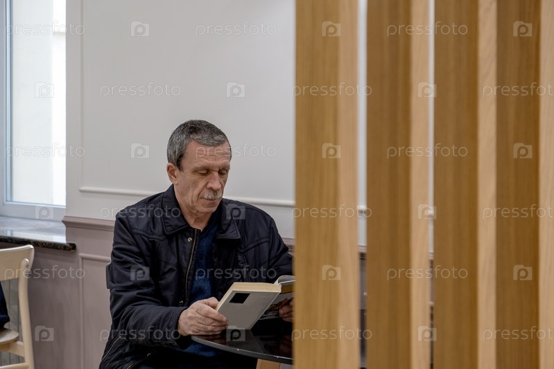 Взрослый пенсионер читает книгу в книжном магазине