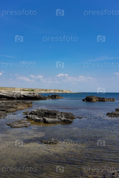 Скалы и камни на фоне моря под голубым небом