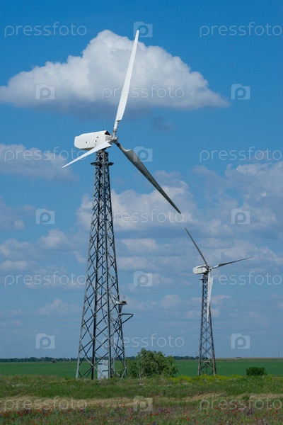 Пейзаж с ветряными электростанциями на фоне зеленого поля
