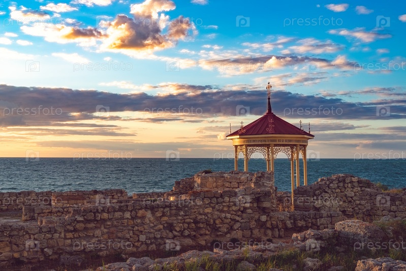 Красивый пейзаж с закатом и королевской беседкой на фоне морского пейзажа