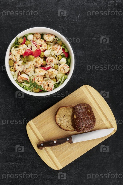 Вкусный салат с креветками, оливками, моцареллой, помидорами, оливками