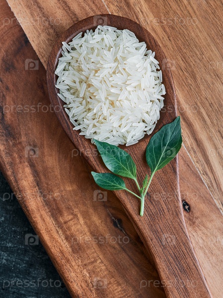 Зерна риса на деревянной ложке крупным планом, макрос