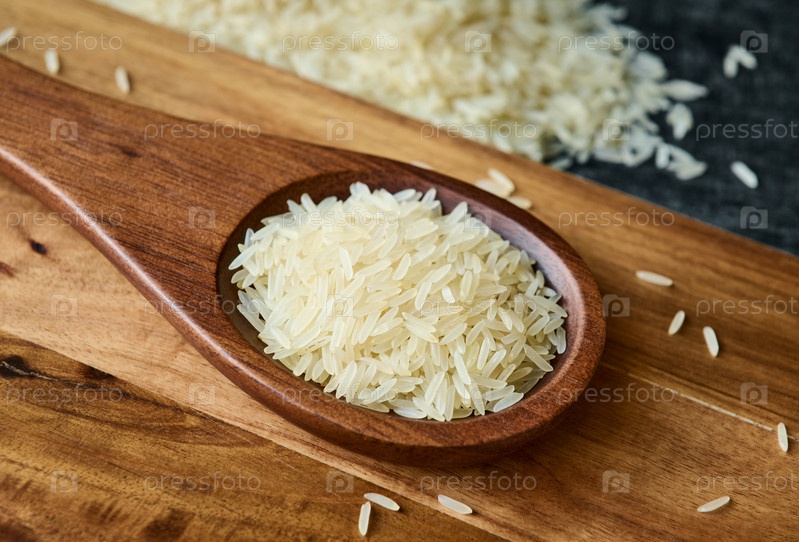 Зерна риса басматти на деревянной ложке крупным планом, макрос