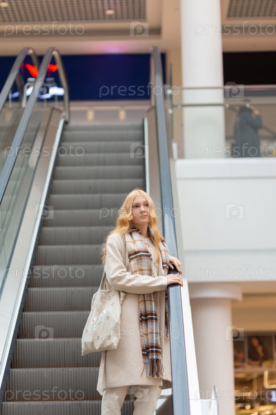 Молодая женщина с длинными светлыми волосами поднимается на эскалаторе в торговом центре