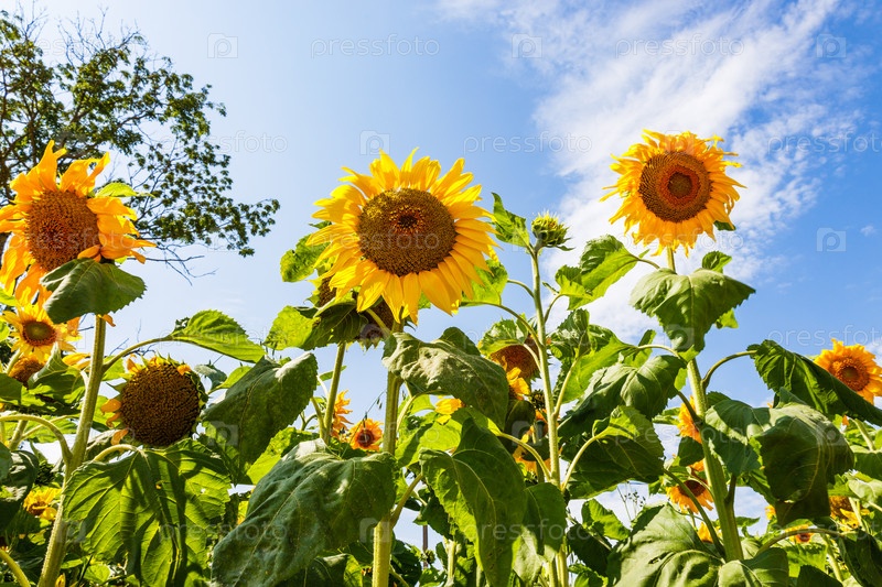 Подсолнухи в саду на фоне голубого неба
