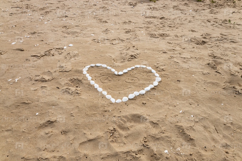 Сердце из морских раковин на морском пляже. Концепция праздничной любви