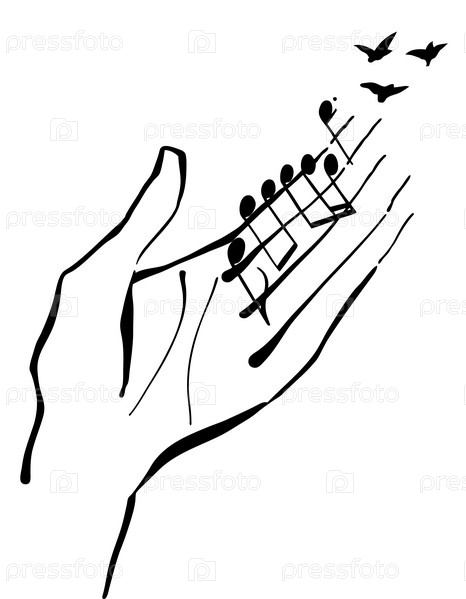 Птичья песня, черно-белое изображение руки, музыкальных нот и птиц