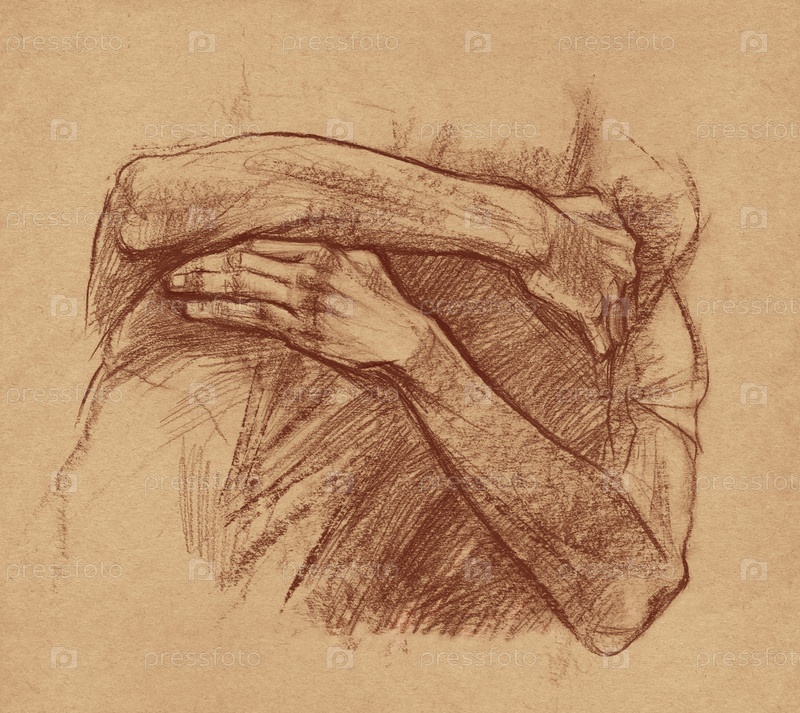 Два человека крепко обнимаются, рисунок в коричневых тонах, руки и плечи