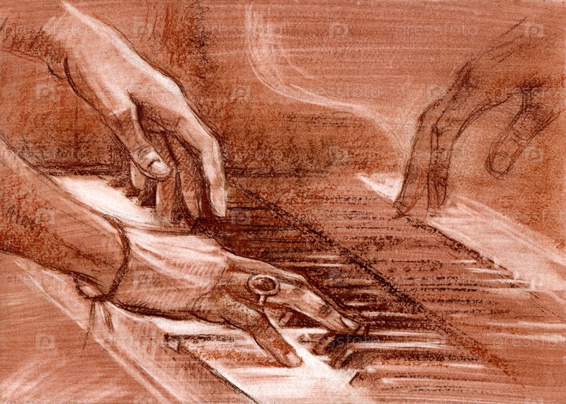Музыкант играет на фортепиано, рисунок в коричневых тонах, руки и клавиши крупным планом