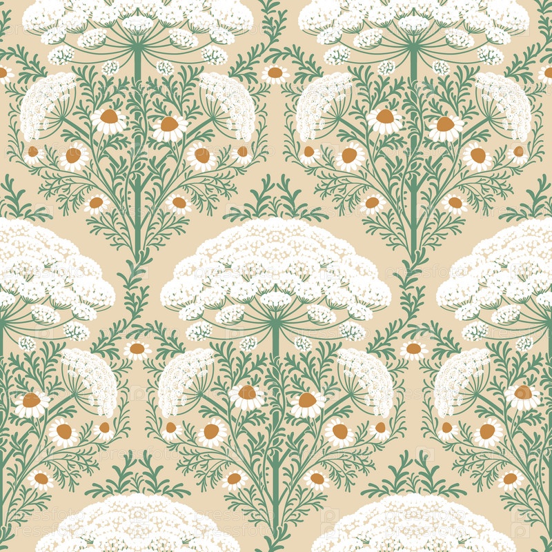 Бесшовный паттерн с крупными белыми цветами-зонтиками и ромашками на бежевом фоне