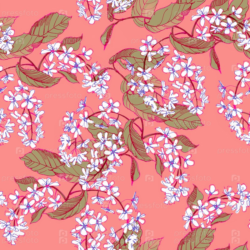 Бесшовный паттерн с цветущей черемухой на розовом фоне
