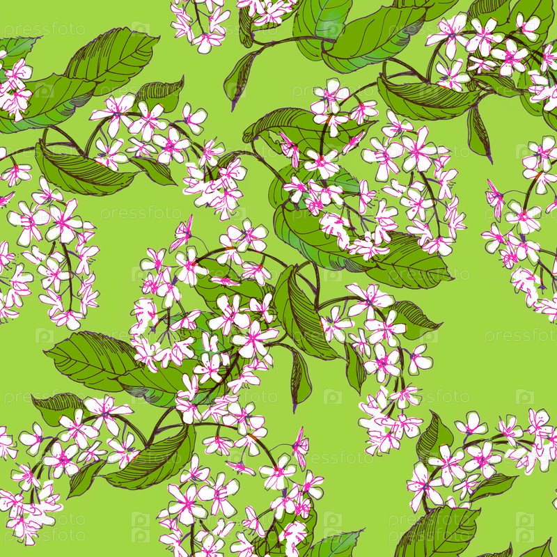 Бесшовный паттерн с цветущей черемухой на светло-зеленом фоне