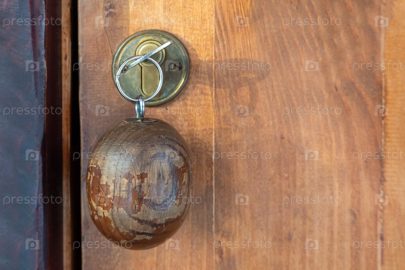 Ключ с деревянным круглым брелком, вставленным в замок. Выборочный фокус. Закрытие ключа на коричневой двери. Концепция безопасности, декорации, вход в комнату