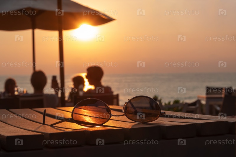 Очки, лежащие на столе на фоне заката. Люди, сидящие за столом на фоне заката на море. Концепция отдыха, релаксации, отпуска. морской закат