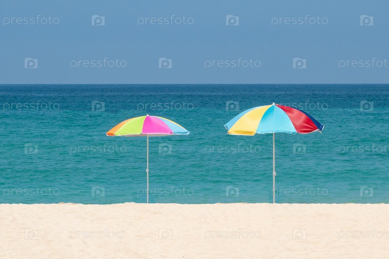 Два зонтика на пляже. Разноцветные зонтики на белом песке. Тропический райский залив, океанская вода и голубое небо. Концепция отдыха, летнее время, праздники, украшения