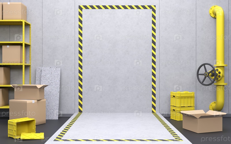 Пустая серая бетонная стена с панелями.Желтые полки с картонными ящиками. 3D визуализация склада