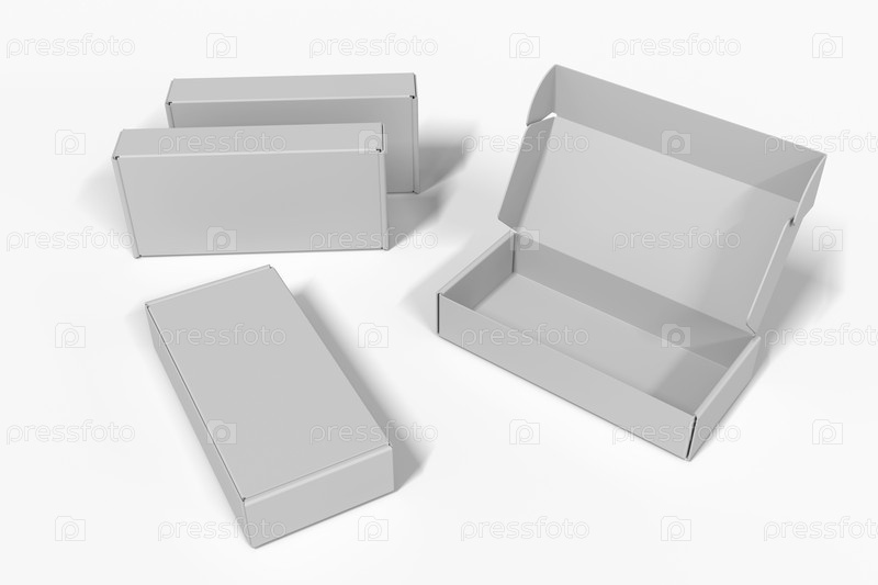 Белые коробки для макетов, пустые открытые и закрытые. 3d визуализация