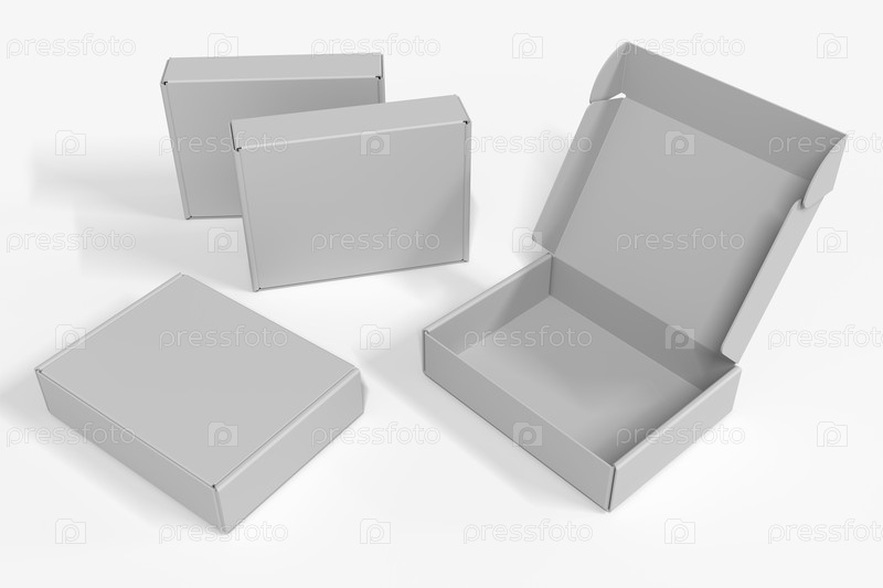 Белые коробки для макетов, пустые открытые и закрытые. 3d визуализация