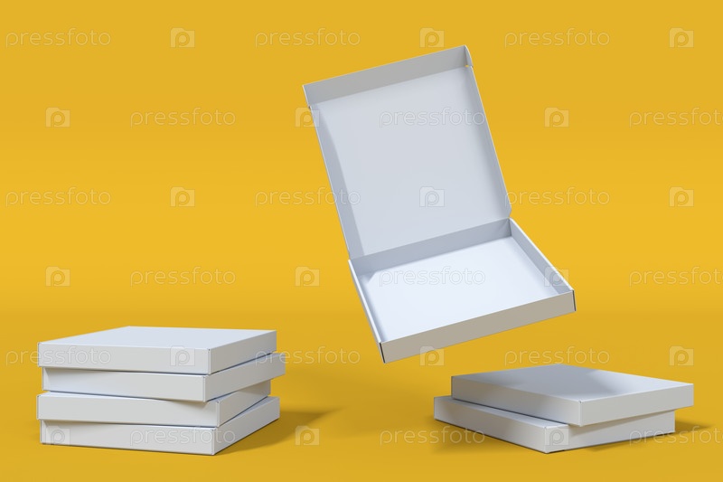 Несколько белых пустых коробок из под пиццы открытых и закрытых на желтом фоне