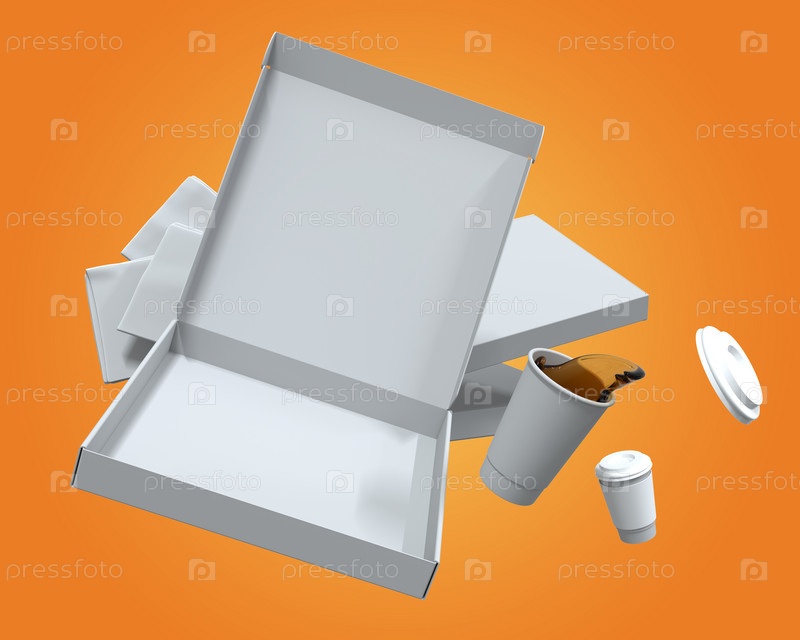 Открытая коробка из под пиццы парит в воздухе вместе с открытым стаканчиком кофе