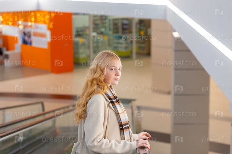 Молодая женщина с длинными светлыми волосами поднимается на эскалаторе