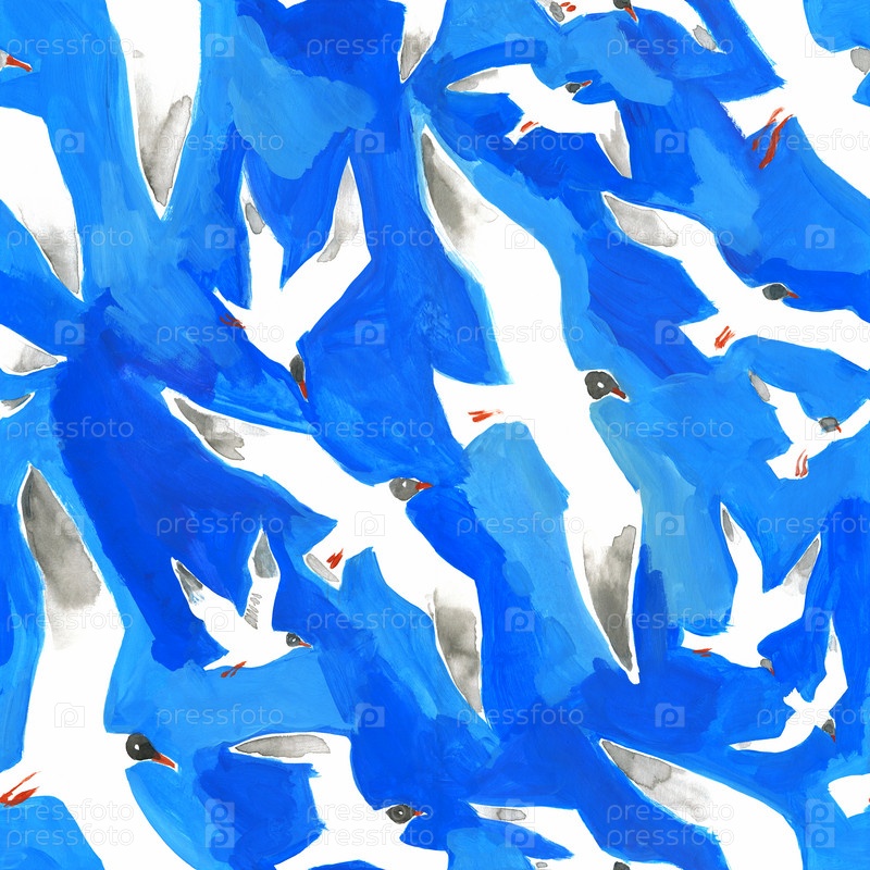 Бесшовный живописный паттерн с летящими чайками на небесно-синем фоне