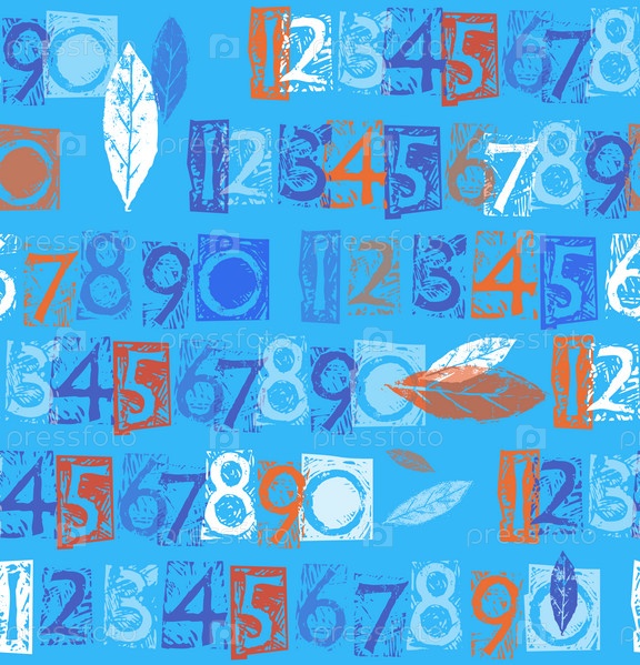 Бесшовный детский школьный паттерн с цифрами и листьями на голубом фоне