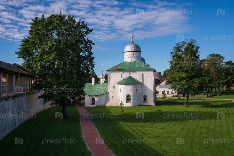 Вид на Никольский (Никольский) собор на территории Изборской крепости (14 - 17 вв.) в солнечный летний день, Старый Изборск, Псковская область, Россия